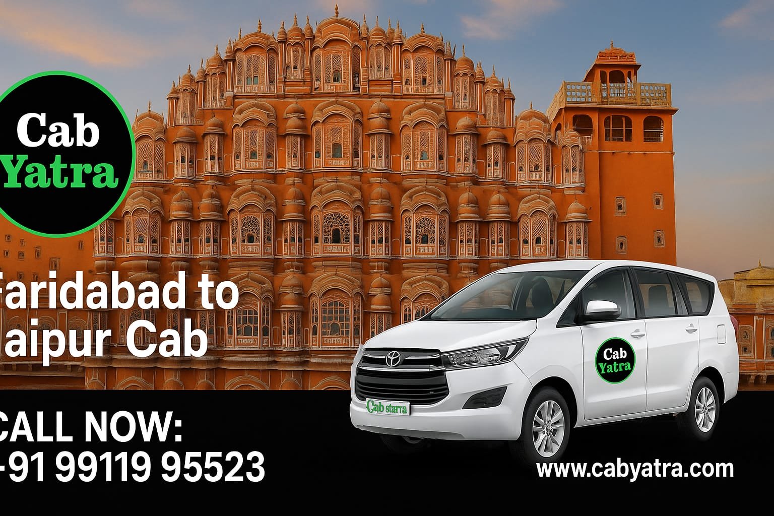 Travel from Faridabad to Jaipur with CAB YATRA at just โน3299. Book now for a comfortable, safe, and affordable taxi ride. Call +91 99119 95523 or visit www.cabyatra.com.