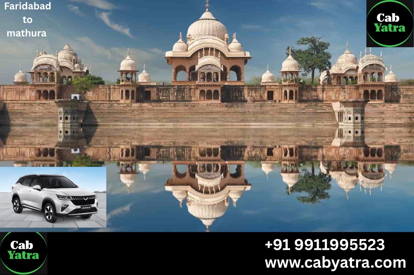 Travel from Faridabad to Mathura in comfort with CAB YATRA cab service starting at ₹1299. Call +91 99119 95523 or visit www.cabyatra.com to book your cab today.